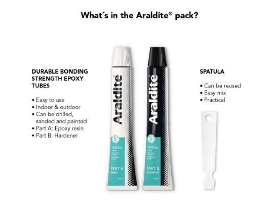 Araldite crystal tubes are a super strong, long lasting, solvent free adhesive ideal to bond ceramics and glass to many other materials. The end results are water resistant and can be sanded or painted for a professional finish.