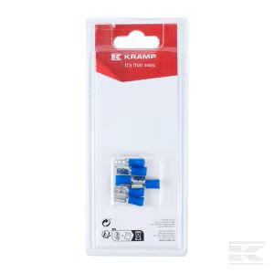 Blade terminal sleeve blue 1.5-2.5mm², double strain relief. Min. cable cross section: 1.5mm² Max. cable cross section: 2.5mm² Connection type: Female Width: 6.3mm Thickness: 0.8mm Colour: Blue Pack of 6